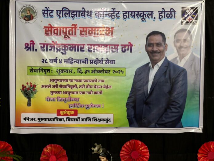 त्यांचा 31 ऑक्टोबर 2025 रोजी सेवापूर्तीचा समारंभ सेंट एलिझाबेथ कॉन्व्हेंट हायस्कूल होळी येथे सकाळी साडेदहा ते एक वाजेपर्यंत संपन्न झाला यासाठी माननीय महापौर श्री प्रवीण शेट्टी साहेब त्याचबरोबर माजी परिवहन समिती अध्यक्ष श्री प्रितेश पाटील न्यू इंग्लिश स्कूल येथील प्रिन्सिपल सौ शोभना वॉज तसेच ग्रामविकास अधिकारी श्री रमेश उंदरे साहेब व ग्राम विकास माजी विस्तार अधिकारी श्री चव्हाण साहेब शालेय कमिटी सदस्य श्री स्टॅनि अलमेडा सर ग्रेगी मेलो सर शाळेचे माजी कर्मचारी विल्सन गोम्स लायन्स क्लब ऑफ युनिक वसईचे अध्यक्ष निलेश घरत सेक्रेटरी दीपक बडगुजर ट्रेझर श्री काळे साहेब तसेच इव्हेट कुटीनो मॅडम उपस्थित होत्या संस्थेच्या मॅनेजर सिस्टर लूसी शाळेच्या मुख्याध्यापिका सिस्टर्स स्मिता आगासकर या उपस्थित होत्या