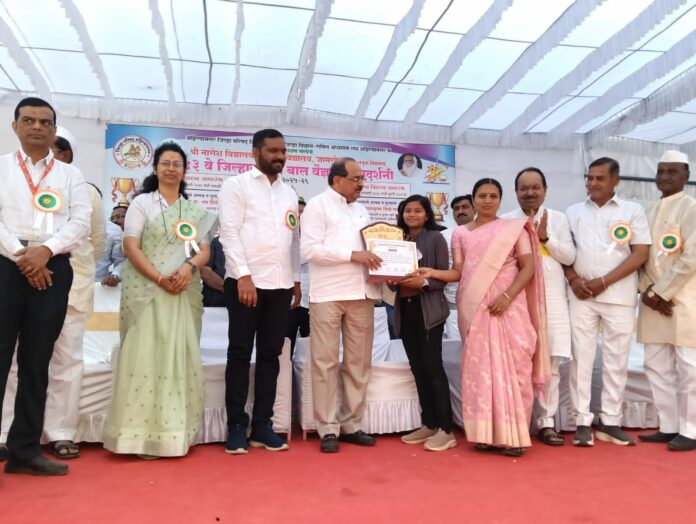 जिल्हास्तरावर जामखेड येथे आयोजित या प्रदर्शनामध्ये पालकमंत्री राधाकृष्ण विखे पाटील यांच्या हस्ते शर्वरीचा पारितोषिक व सन्मान चिन्ह देऊन गौरव करण्यात आला.त्यावेळी सोबत शिक्षिका सोनाली सुसे होत्या.