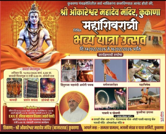नेवासा तालुक्यातील कुकाणा व परिसरातील भाविकांचे श्रद्धास्थान असलेले कुकाणा येथील श्री क्षेत्र ओंकारेश्वर महादेव मंदिरात महाशिवरात्रीनिमित्ताने यात्रोत्सव शनिवार दि. १४ फेब्रुवारीपासून प्रारंभ होत आहे. यानिमित्ताने विविध धार्मिक कार्यक्रमांचे आयोजन केले असल्याची माहिती यात्रोत्सव समितीने दिली आहे.